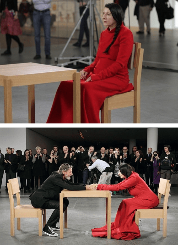 En esta obra realizada en el Museum Of Modern Art en Nueva York (MoMA), Marina se sentó en el centro de una sala del museo frente a una mesa y otra silla vacía, invitando a los espectadores a pasar a sentarse frente a ella por el tiempo de su elección, con el único objetivo de verse mutuamente a los ojos. Ella cerraba los ojos cuando la silla estaba vacía y mientras el participante caminaba hasta la mesa, y los abría solo cuando lo escuchaba sentarse frente a ella. De esta forma, no había ni saludos ni despedidas, solo abrir los ojos y volverlos a cerrar. Es una dinámica que puede llegar a sonar simple, pero en realidad suponía crear una conexión netamente con la mirada durante el tiempo en que el espectador o “el visitante” permaneciera sentado frente a Marina. Las personas podían llegar a ocupar la silla por cinco minutos o por una hora y media, y la fila para esperar turnos se extendía hasta la calle fuera del museo. La performance duró siete horas diarias, por tres meses seguidos, estableciendo múltiples conexiones silenciosas todos los días. Este trabajo es de los más ampliamente interpretables del repertorio de performances de la artista. No hay un solo mensaje que Abramović haya buscado transmitir al sentarse en esa silla, sino que cada visitante era un mensaje nuevo. Una experiencia nueva de la cual se llevarían algo. Había gente que lloraba conmovida, que sentía un profundo cariño repentino por la artista y no podía dejar de sonreír, o que permanecían estoicos e inmóviles como ella al otro lado de la mesa. Pero, uno de los momentos más memorables de este performance, fue cuando Marina abrió los ojos en una de estas varias ocasiones y frente a ella estaba sentado Ulay, por primera vez desde haber realizado Lovers en el 88. Se encontraron 22 años después de su separación definitiva. Marina llevaba días y días sin emitir ninguna expresión facial y sin moverse hasta que él se sentó frente a ella. Ambos lloraron conmovidos y, por primera vez en su carrera, Marina rompió sus propias reglas y se movió hacía al frente para tomar las manos de Ulay. Este momento fue tan interpretable como el resto de todo el performance, pues si bien desde el punto de vista del público podemos catalogar esta silenciosa y emocionante interacción como un reencuentro icónico y lleno de amor, la verdadera esencia de lo que pasó, el pasado que regresó a ellos en el momento en el que ambos artistas se vieron, lo saben y solo lo sabrán ellos dos propiamente, lo cual enmarca muy bien todo el mensaje u objetivo principal de la obra; mientras las dos sillas de la mesa estén ocupadas, solo esas dos personas sabrán que tipo de conexión están estableciendo.