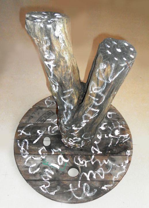 6. Poema-objeto. “El árbol que no fue”. Medidas variables y con altura de 1 metro. Donada al Museo MAVET del Táchira, Venezuela. Técnica: objetos de madera encontrados e instalados con poema en pintura acrílica. 2022.
